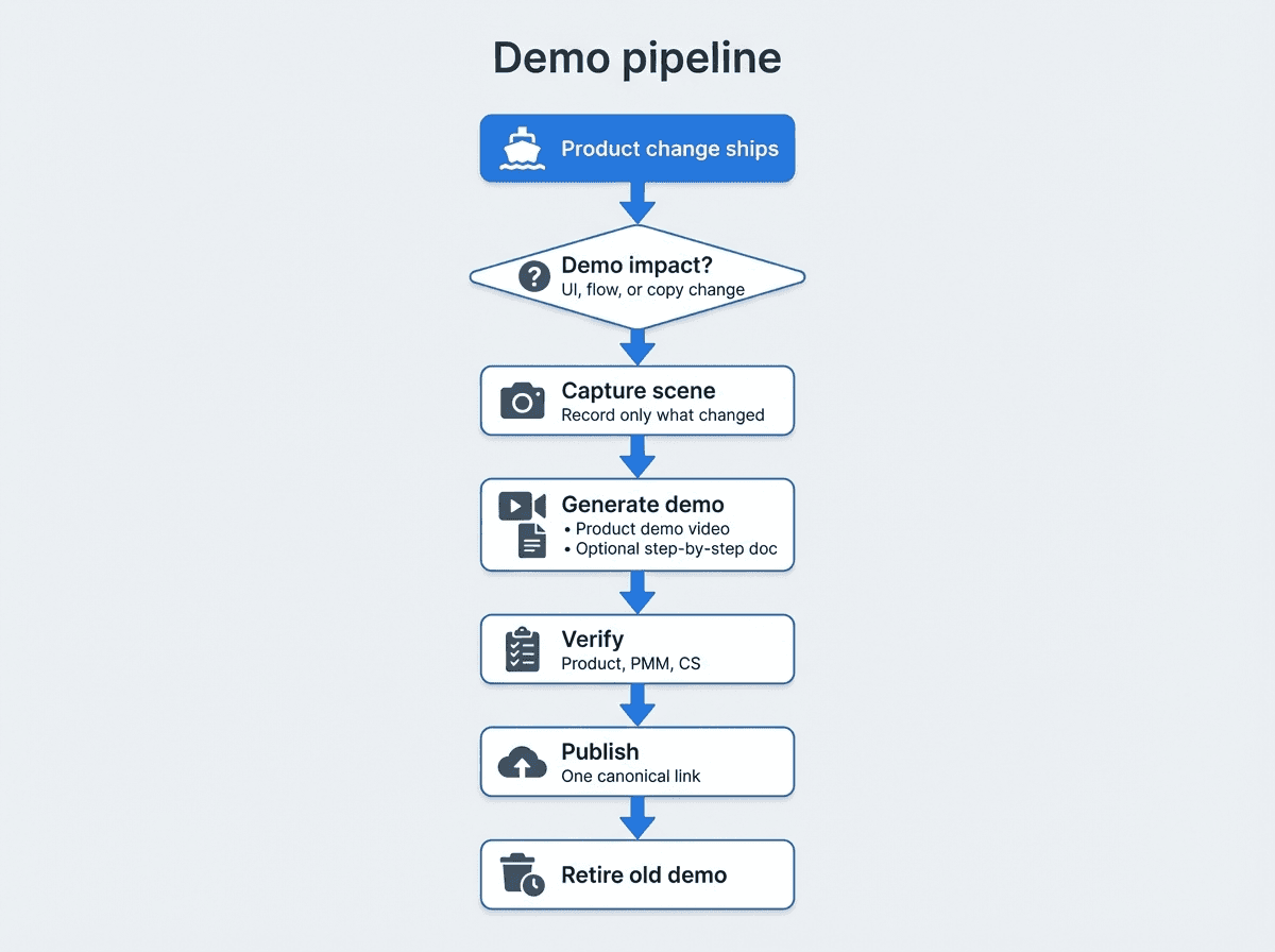Track update latency, assign a demo owner per workflow, keep a two-lane library (evergreen vs launch), and retire stale assets aggressively. Quality is not “prettiness,” it’s “accuracy plus speed.”