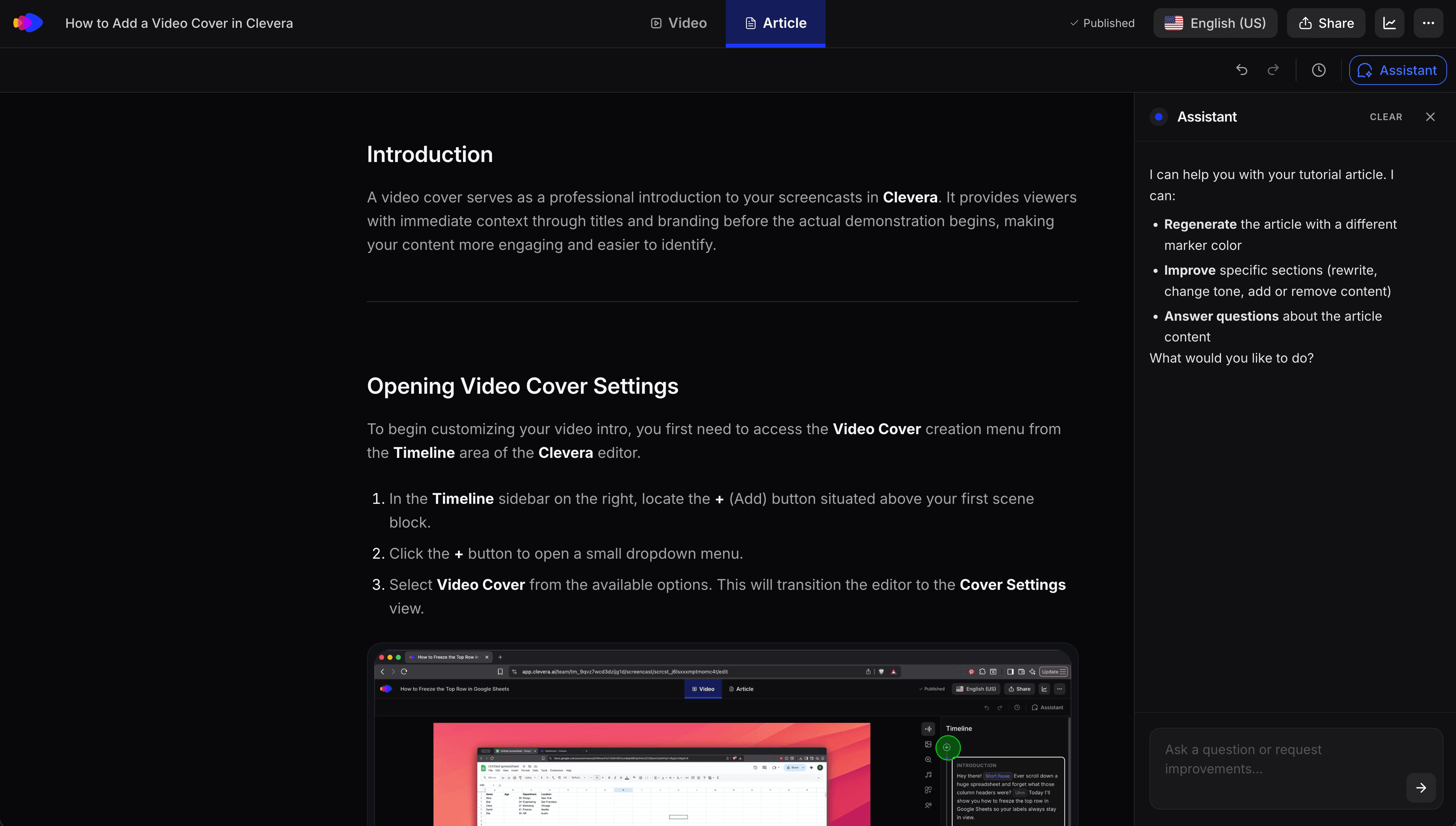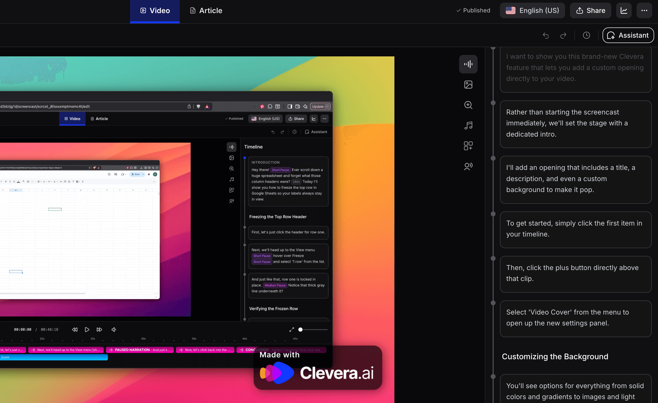 More advanced tools like Clevera go further. They analyze the full context of your screen activity, write a detailed voiceover script based on what's happening on screen (not just what you clicked), generate AI narration, produce a polished tutorial video alongside the written article, and embed relevant screenshots with proper captions.