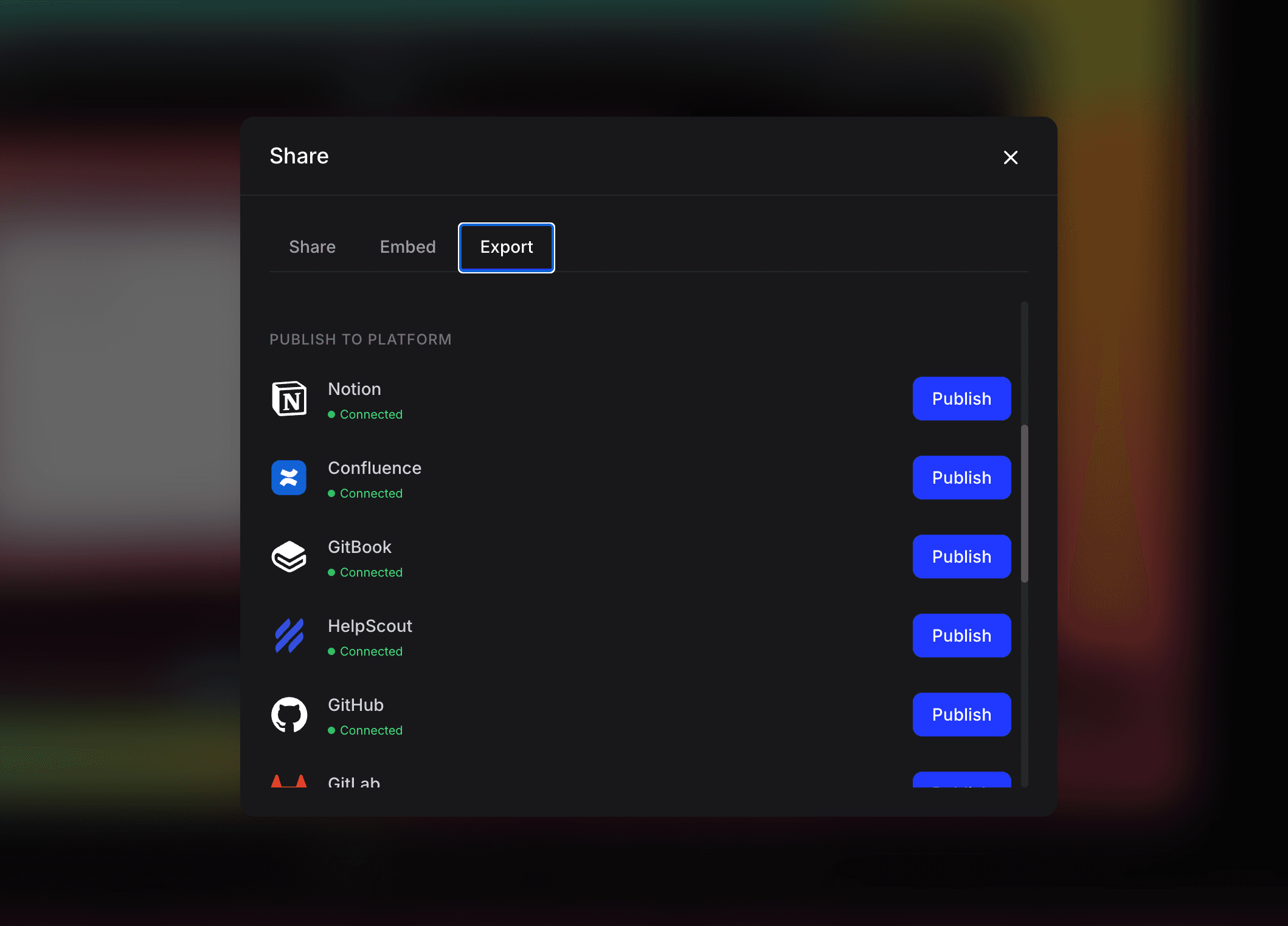 Export to your stack: your documentation needs to live somewhere your users can find it. The generator should publish directly to the platforms you already use, not require manual copy-paste every time.