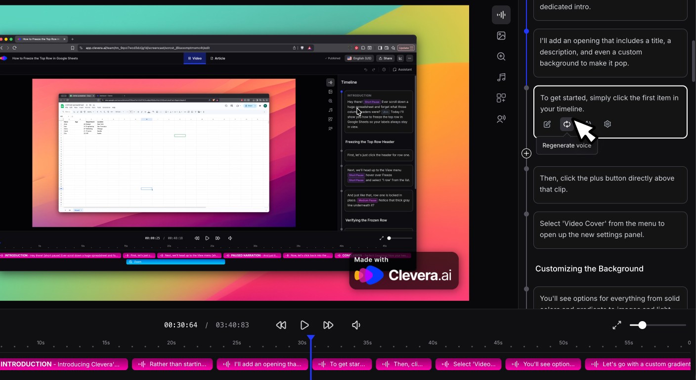 Record your next Clevera video and say one intent sentence every time you change screens. Then do a single AI assistant pass, and regenerate any odd line once.