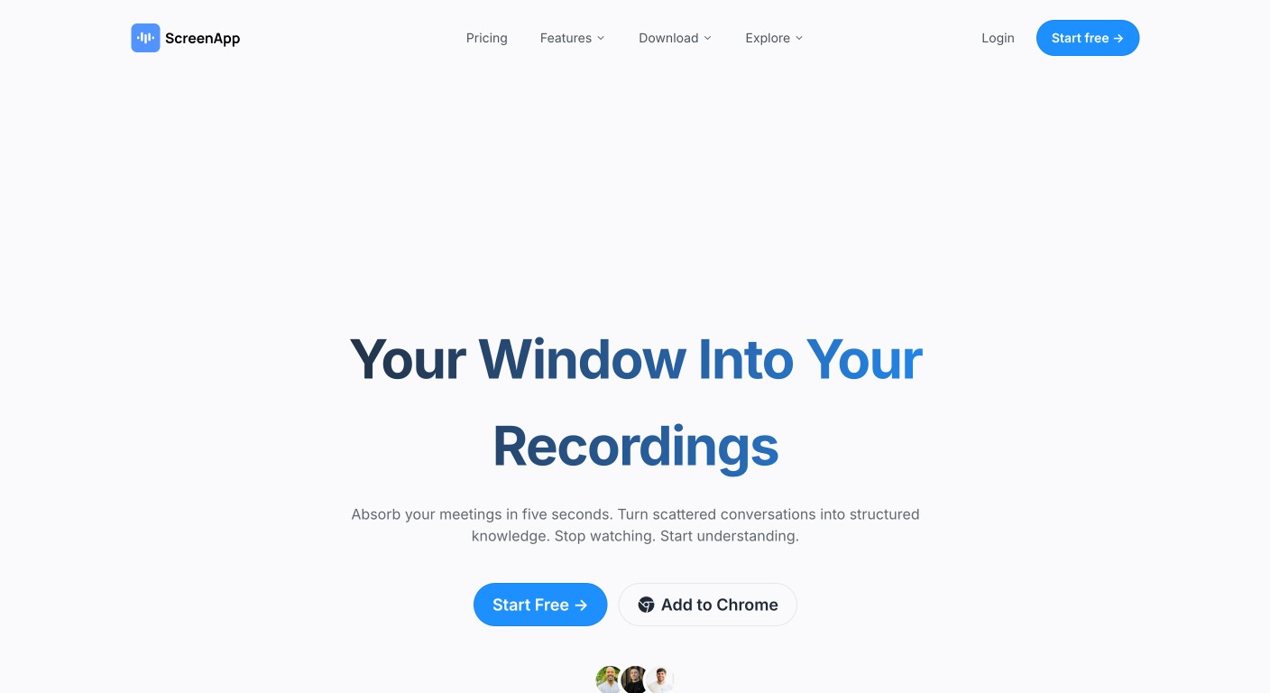 ScreenApp is the simplest tool on this list. No desktop app to install, no configuration, just open a browser tab and record. For occasional use cases where you need something quick and disposable, it does the job. It also includes AI transcription and basic search.