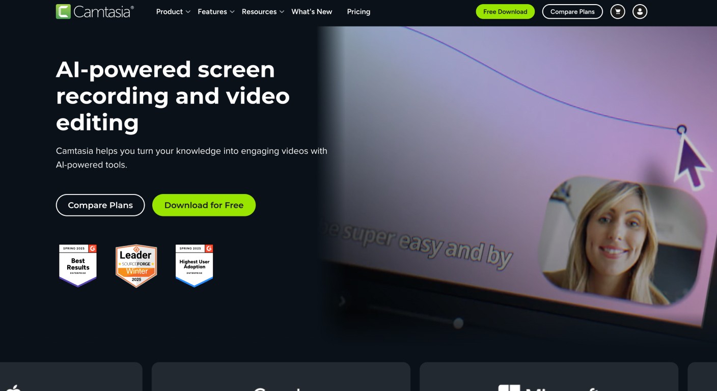 Camtasia has been around longer than most, and for good reason. It is a heavyweight desktop suite. While it now includes AI script and voice generation, it’s best for those who want total manual control over a multi-track timeline.