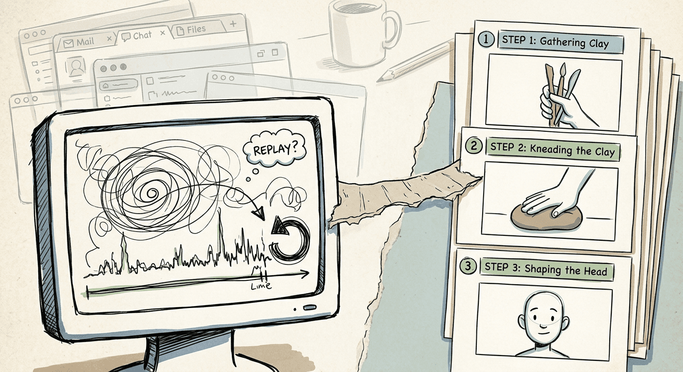 A screen recording captures what you did, not what someone needs to learn. Real walkthroughs include hesitation, backtracking, tab-switching, and dead time. Even a perfectly executed recording needs real structure before it becomes useful: numbered steps, a title per step, screenshots at the right moments, and a sequence that makes sense to someone who doesn't already know the answer.