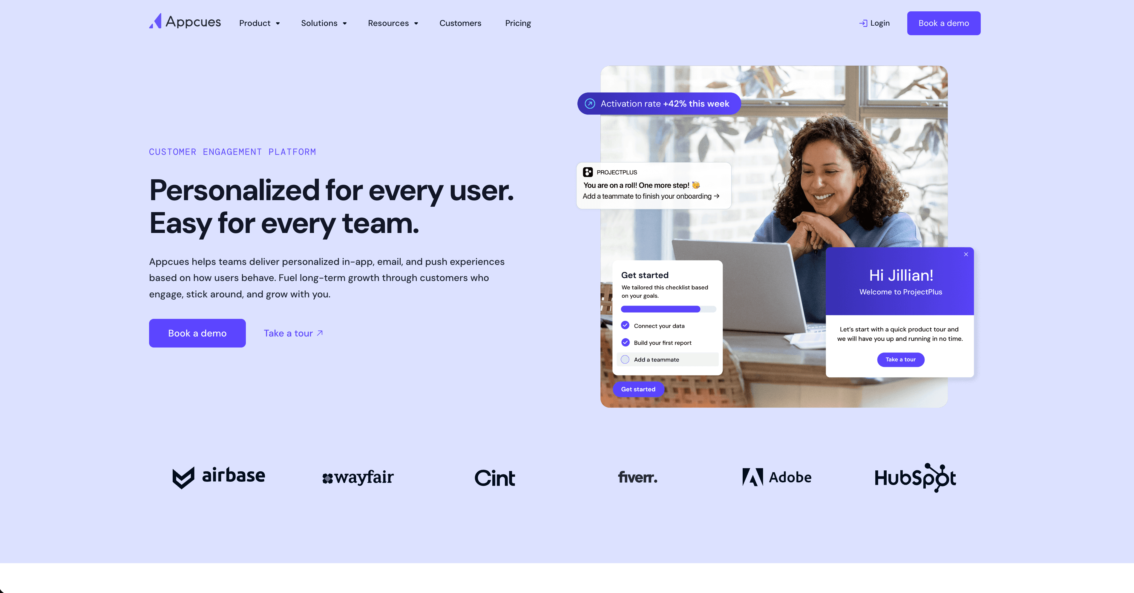 Appcues is a no-code product adoption platform that lets non-technical team members build in-app flows — onboarding checklists, modal announcements, tooltips, and product tours — using a visual editor.