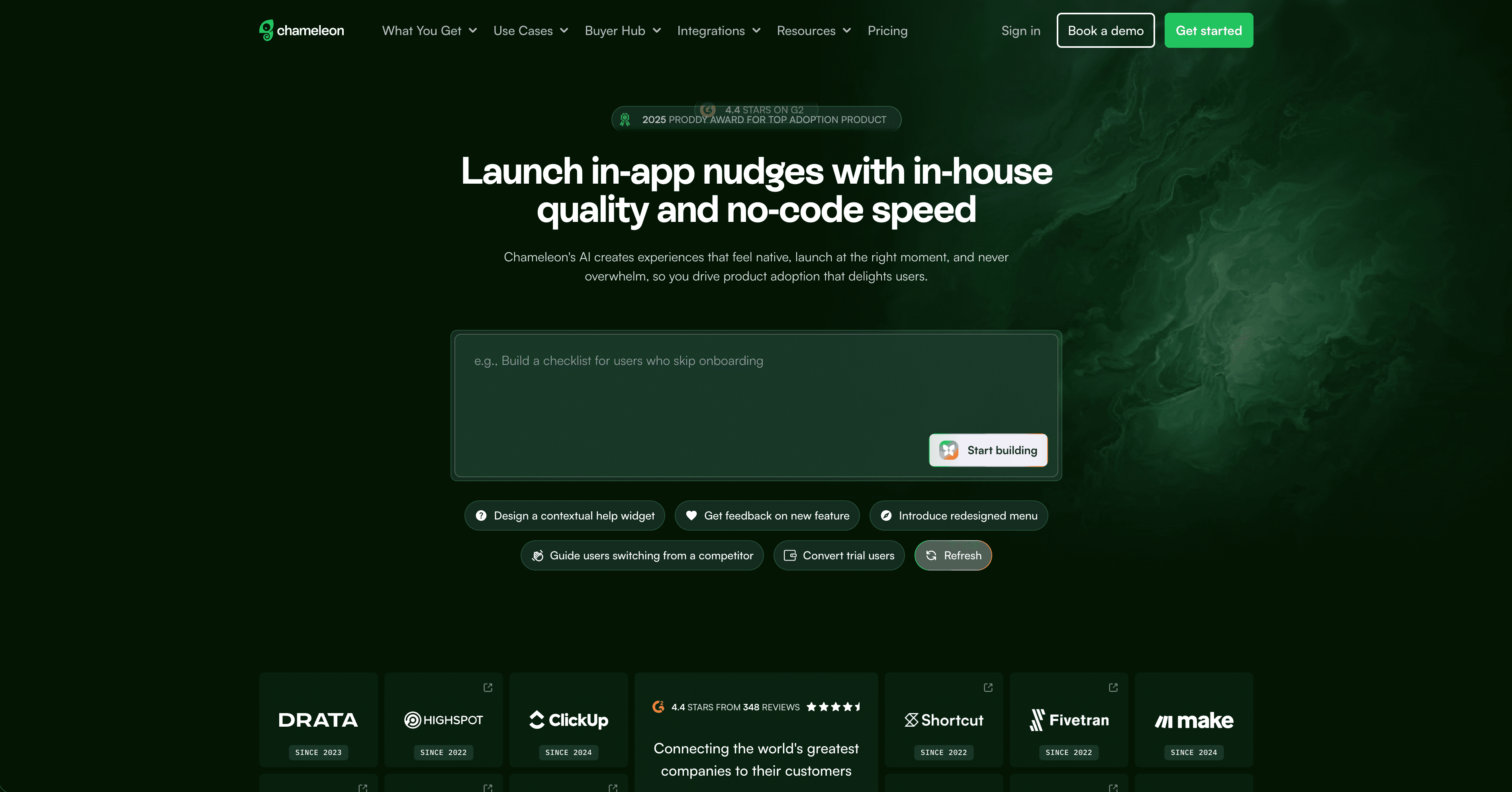 Chameleon is a product adoption tool with a focus on in-app experiences — launchers, tooltips, microsurveys, and tours. It's modern, developer-friendly, and integrates cleanly with most SaaS stacks.