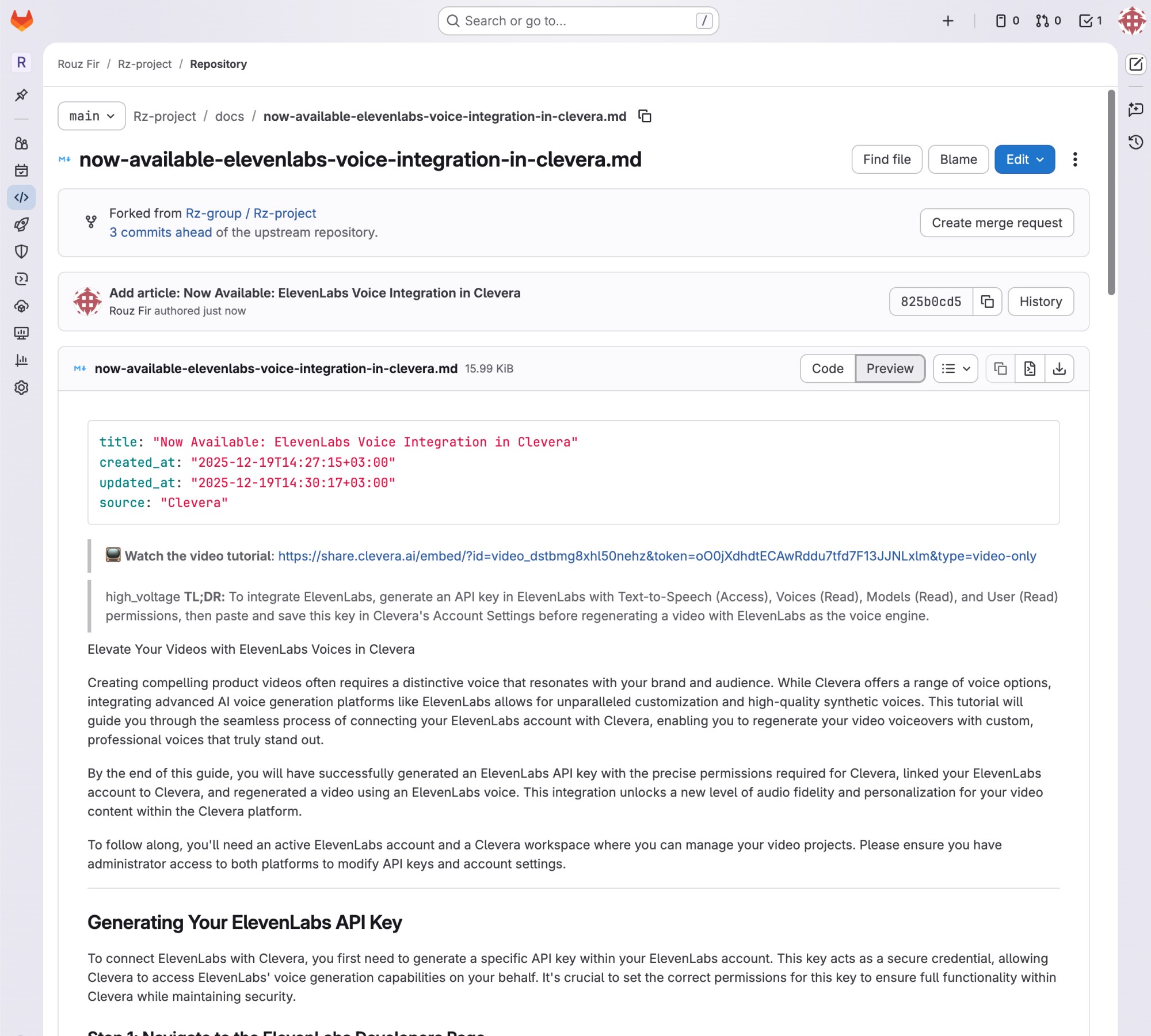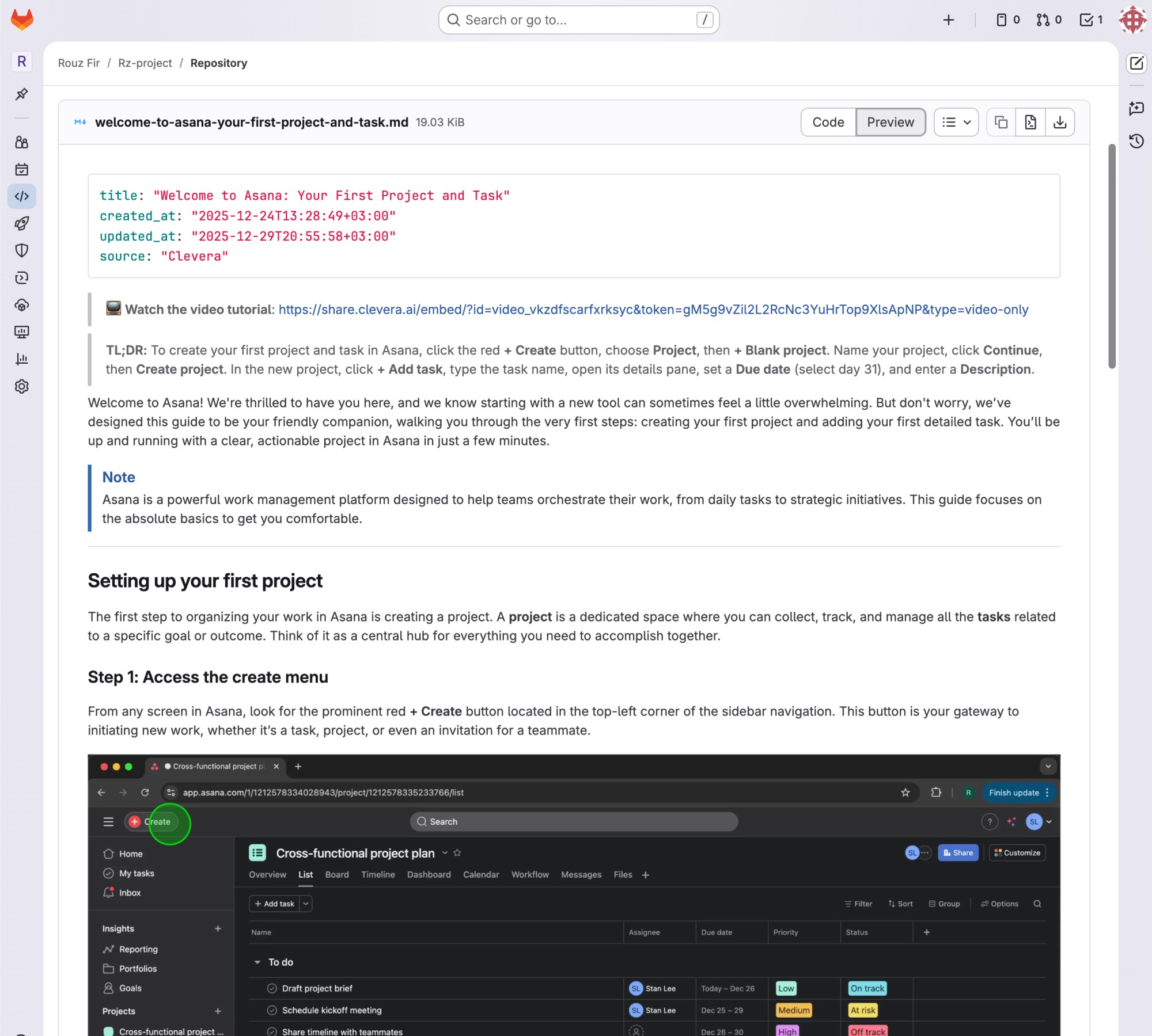 Update the video or article inside Clevera, then republish to the same location in GitLab without creating duplicates or broken links.