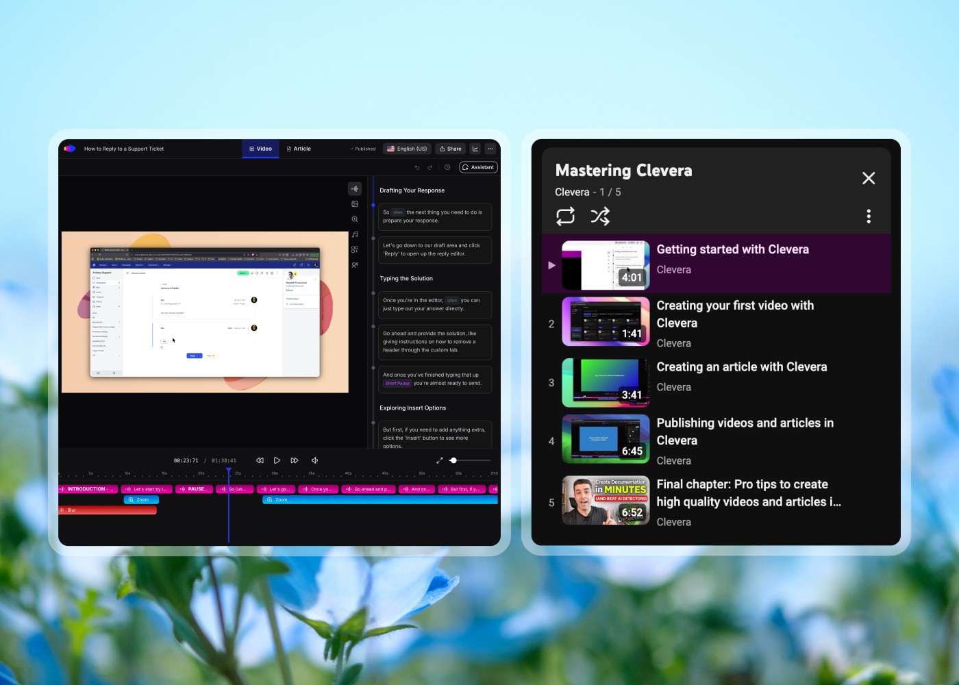 Record your screen. Clevera removes the mistakes, adds smart zooms, generates the voiceover, and produces the finished tutorial plus a written version. From recording to published in under 15 minutes.