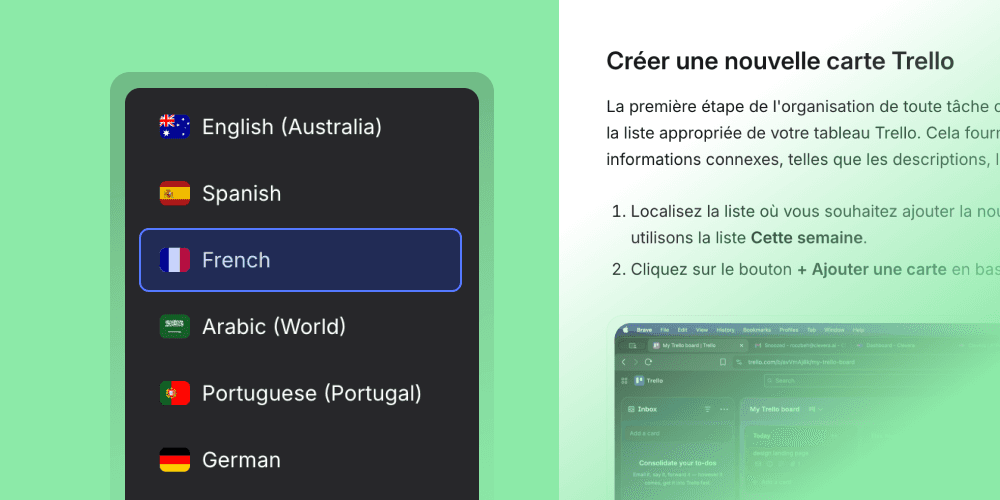 Localize your demo video and companion leave-behind into any of 74 languages in minutes — no re-recording for international deals or partner markets.