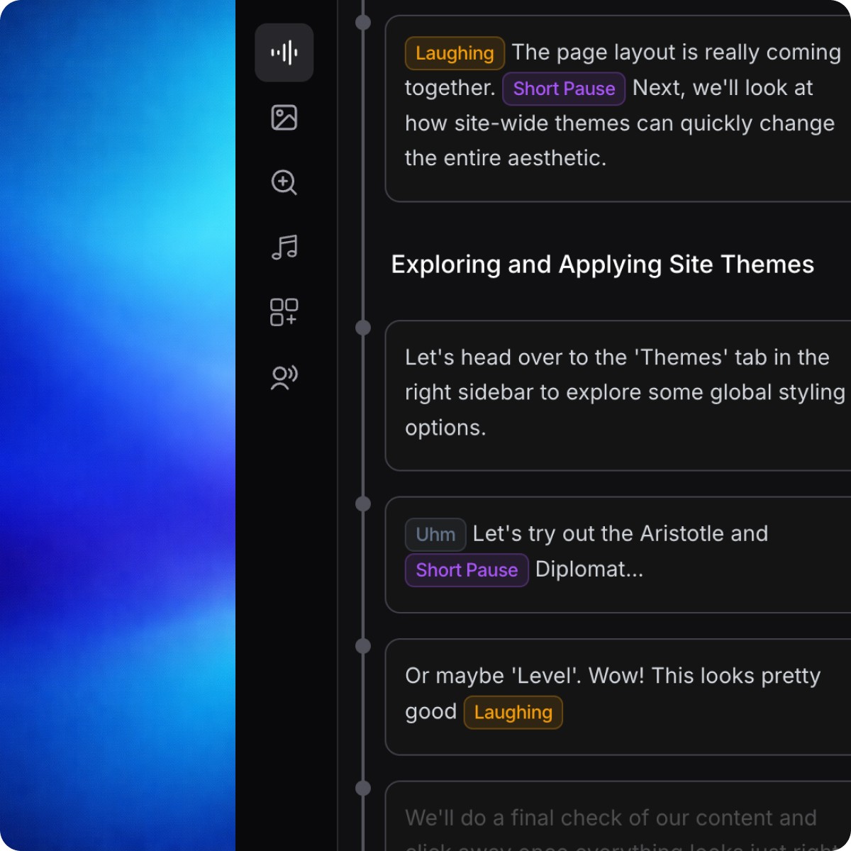 No microphone. No retakes. Clevera writes a clear narration from what happened on-screen, then generates a natural voiceover that matches your tone.