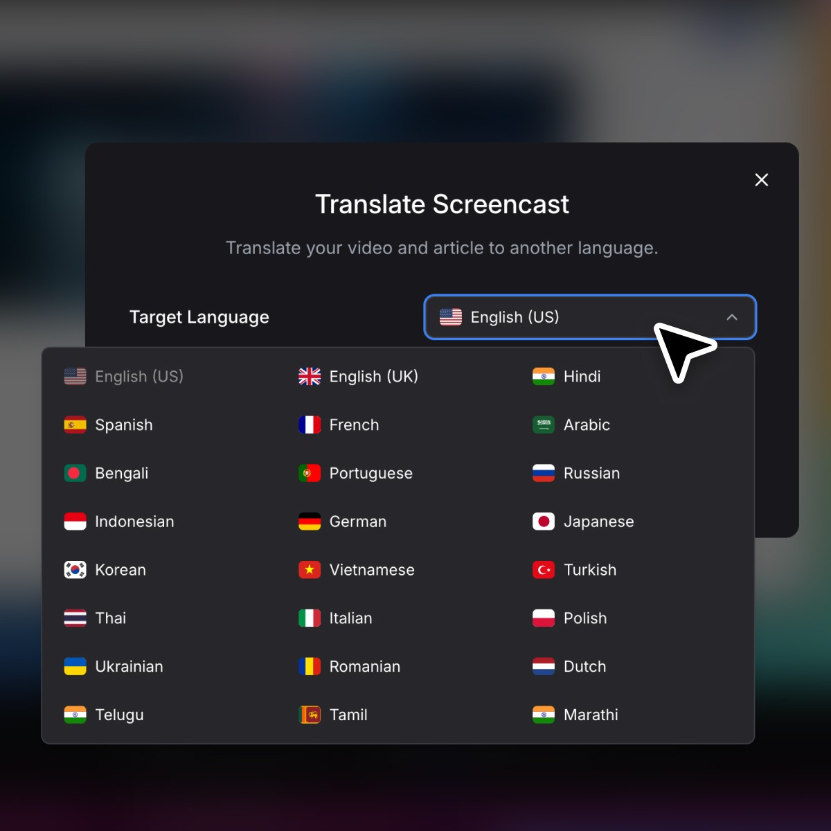 Turn one tutorial into 23 languages with consistent voice and terminology. Great for support teams serving multiple markets and companies with non-English product experts.